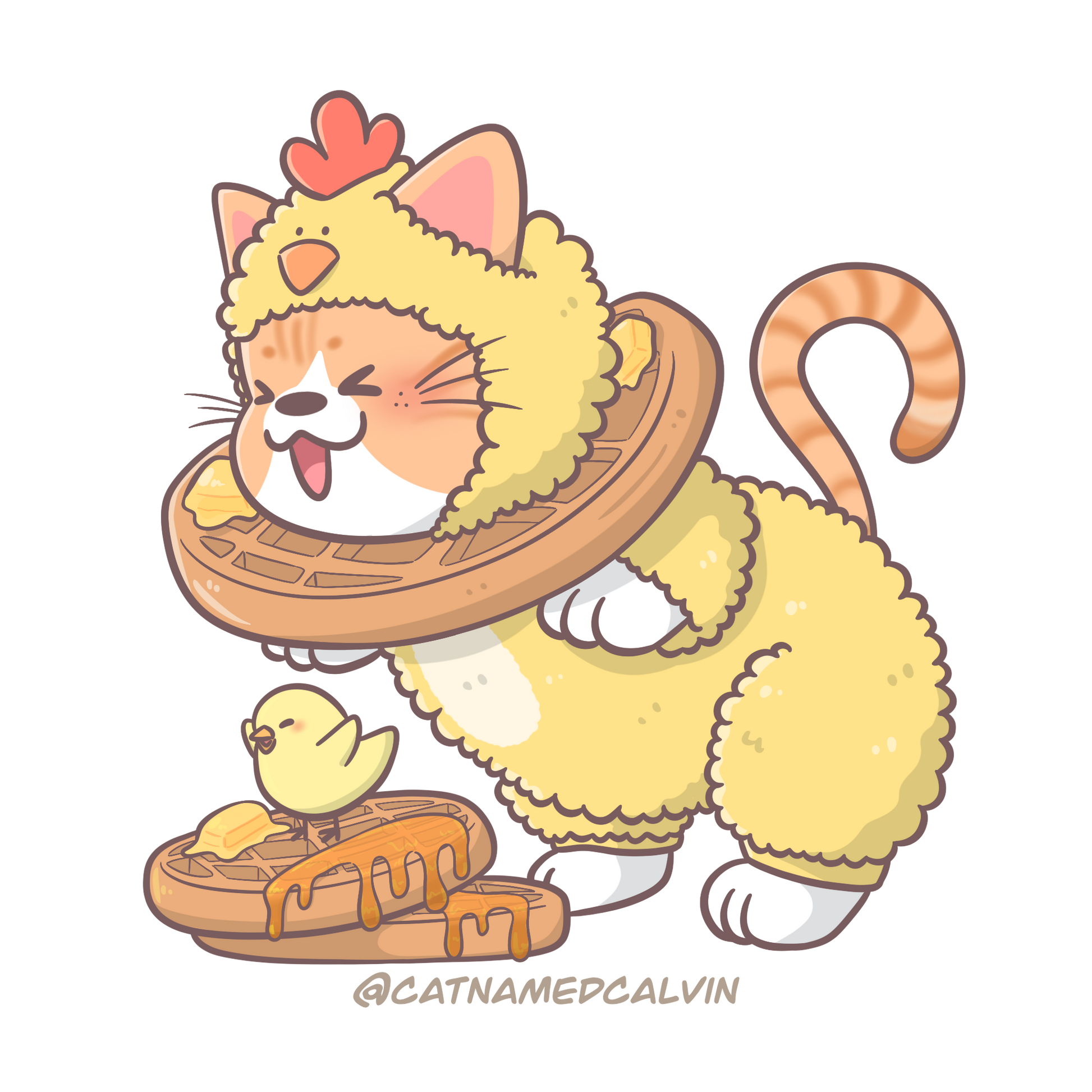 3" matte vinyl sticker of Cat Named Calvin in his chicken and waffles costume